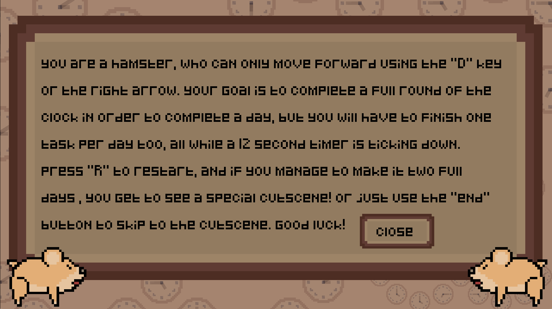 In "Running Against Time", you play as a hamster who is desperately running on a clock that is ticking away. Every day brings a new task for the hamster to complete, all while having to run the full circle in 12 seconds or less. Can you beat the game and get the special cutscene at the end?